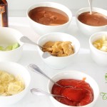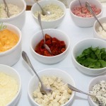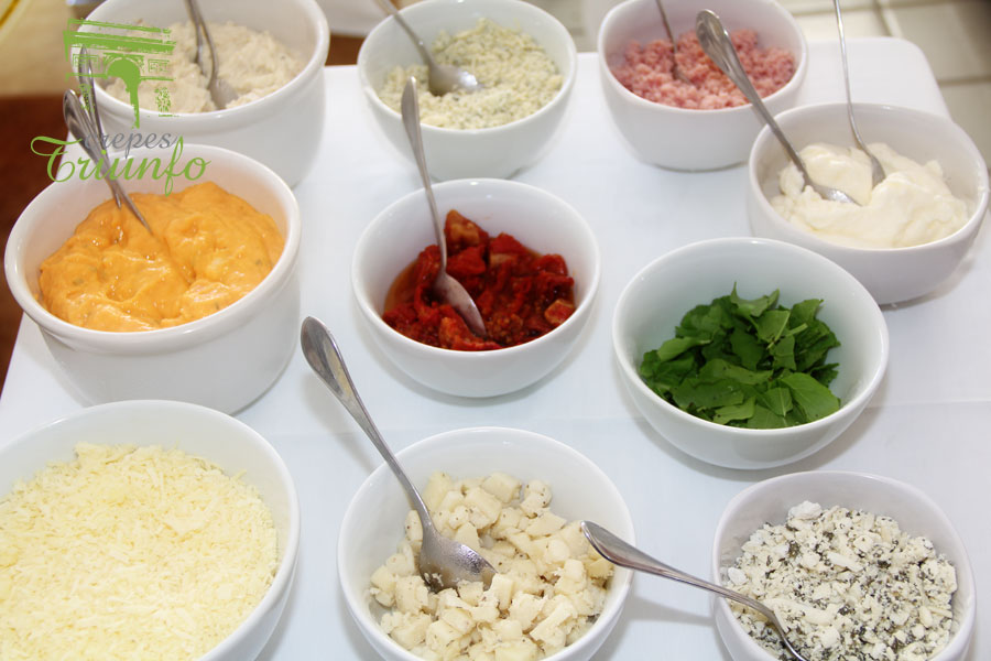 Molhos rosê e italiano para salada. Molhos quentes de queijo roquefort e ao sugo para os crepes.