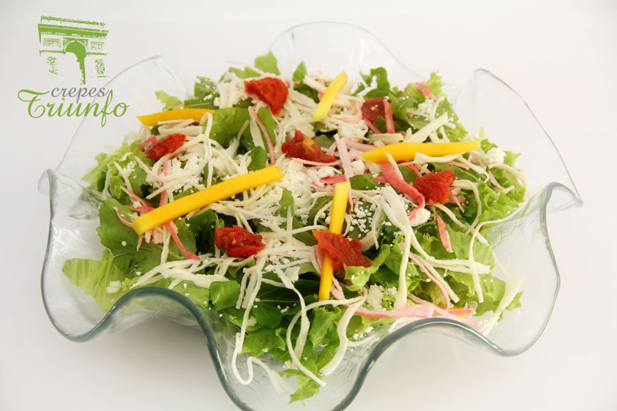 Salada de alface americana, rúcula, tomate seco, manga, kani e ricota.